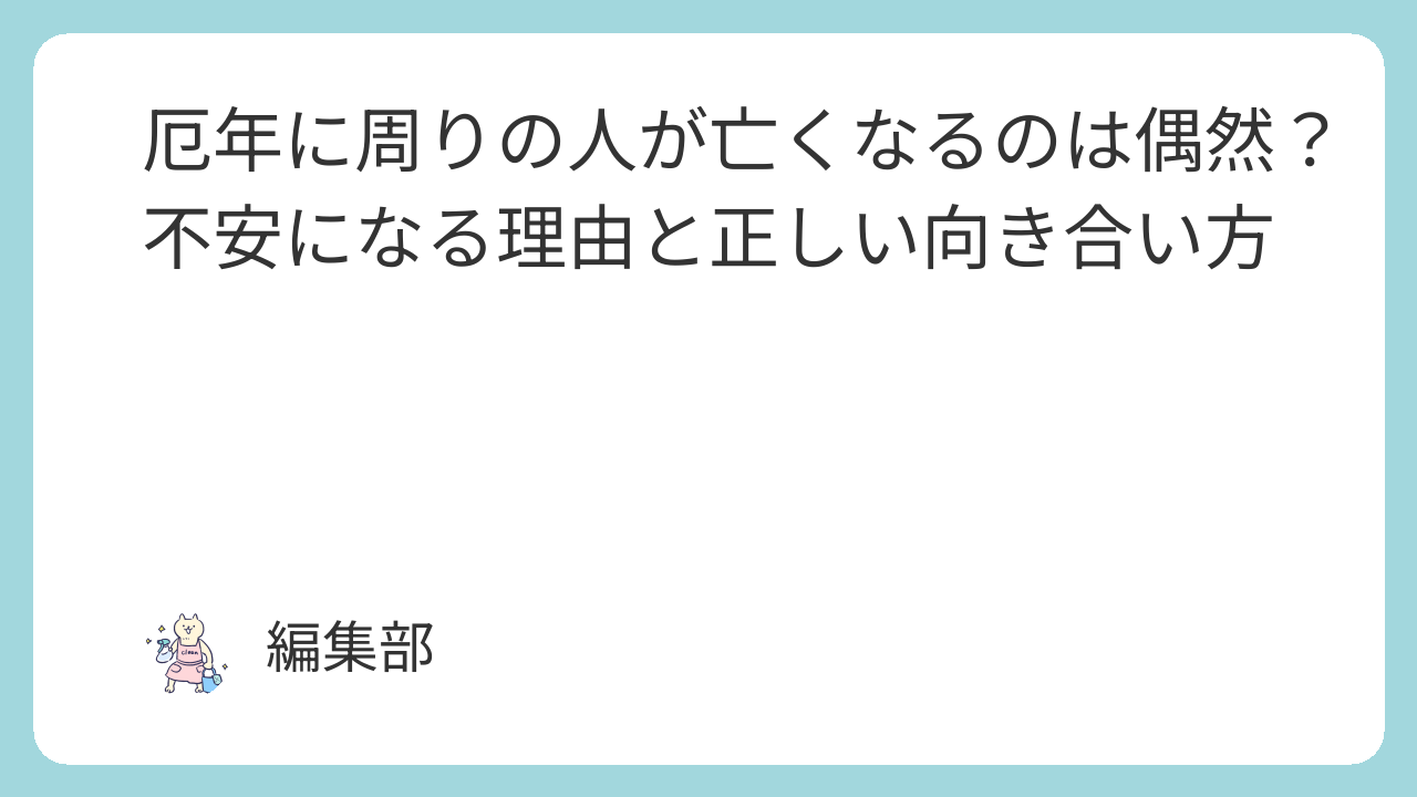 しかし、その不安が必要以上に大きくなり、日常生活や心の健康に影響してしまうことも少なくありません。本記事では、厄年と周囲の人の死に本当に関係があるのかを冷静に整理し、不安な気持ちとどう向き合えばよいのかを丁寧に解説します。読後には、気持ちが少し軽くなり、前向きな行動を選べる状態になることを目指します。