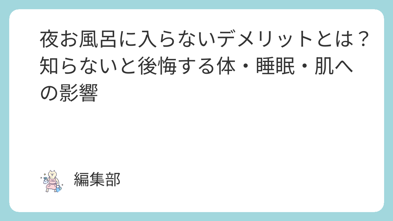 夜お風呂に入らないデメリットは、体臭や汚れが残るといった表面的な問題だけではありません。睡眠の質が下がり、疲労回復が遅れやすくなることで、日々の体調や気分にも少しずつ悪影響が積み重なっていきます。さらに、皮脂や汚れが十分に落ちないことで肌トラブルが起こりやすくなり、見た目や清潔感にも影響を与えます。このように、小さな習慣の違いであっても、それが毎日続くことで体調や生活の快適さを大きく左右する結果につながります。まずは完璧を目指すのではなく、週に数日でも夜入浴を意識してみることが、無理なく始められる生活改善の第一歩になります。この記事が役に立ったと感じたら、ぜひ保存やシェアをして、日々の生活習慣を見直すきっかけとして活用してください。